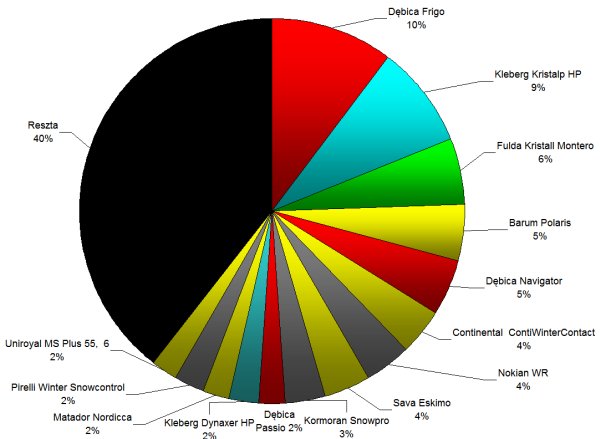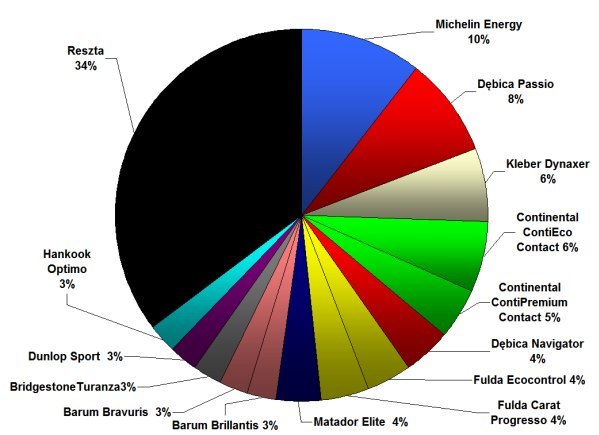 From my research, it appears that the queen of winter tires in my city is Debica with the FRIGO model, which can be approx. 10% of all acquired tires. It is a Polish tire, and its most popular Frigo 2 model costs approx. 175 PLN (195/65 R15) [ 45 USD]. Ten percent is a lot at such a large occurrence of brands and models. In total, Debica has the largest market share because as many as 17% of their products.
